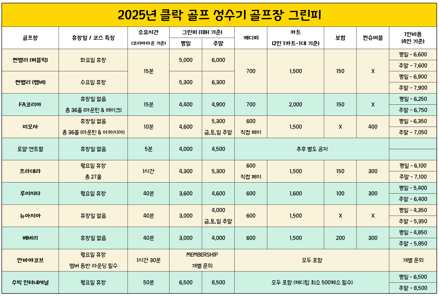 | 클락 골프 성수기 완벽 가이드 - 2025년 성수기 클락 골프장 그린피 총 정리!! (0) | 2025.10.13 |